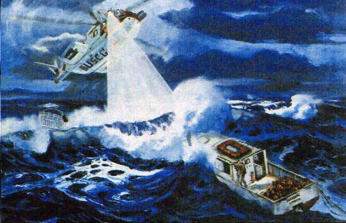 The helicopter arrived in the area and was able to locate the Marlene. With down steering, no engine and very poor communications the only choice was to get Holden off the boat. As the C-130 circles overhead, it relayed messages from the helicopter to the Rescue Coordination Center at Kodiak. It was reported that the crew of the 1471 was having difficulty getting the hoist down to the boat. After struggling for well over an hour, Lt Rivas decided it just couldn't be done in the high seas and hurricane force winds. However, before the 1471 was to leave the scene, they would try to drop a radio to Holden to improve communications between him and other rescue units. | ||||||