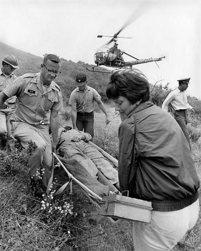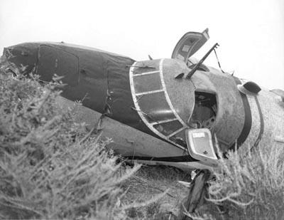 | When the plane crashed, the main fuselage section remained upright and intact. However, the tail section broke off at about the crew entrance door, and came to rest upside down. "We were fortunate that we hit a gentle slope, otherwise it might have been much worse," said Malcolm. "Most of the injuries were sustained by crewmen in the back being thrown out of the aircraft on impact." |
