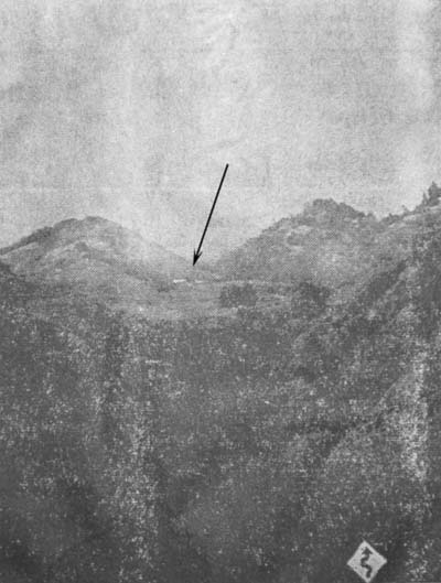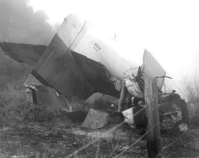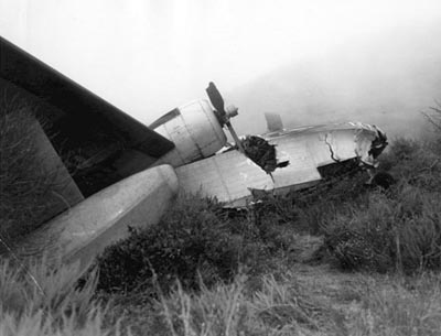 | Photo of the crash site shows the wing and tail of the HU-16E (center) resting near trees on the hillside. | ![]() |