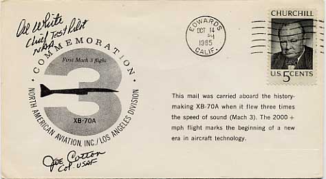 As impressive a technological feat as the B-70 represented, the aircraft was under development at a time when the future of the manned bomber was uncertain. During the late 1950s and early 1960s, many felt that manned aircraft were obsolete, and the future belonged to missiles. As a result, the Kennedy Administration ended plans to deploy the B-70. Two experimental XB-70A prototypes were under construction at North American Aviation when the program was canceled. The first XB-70A (Tail number 62-0001) made its first flight from Palmdale to Edwards Air Force Base, Calif., on September 21st, 1964. Tests of the XB-70's airworthiness occurred throughout 1964 and 1965 by North American and Air Force test pilots. The Flight Research Center prepared its instrument package. Although intended to cruise at Mach 3, the first XB-70 was found to have poor directional stability above Mach 2.5, and only made a single flight above Mach 3. Despite the problems, the early flights provided data on a number of issues facing SST designers. These included aircraft noise, operational problems, control system design, comparison of wind tunnel predictions with actual flight data, and high-altitude, clear-air turbulence. On October 15th, 1965, the 'Valkyrie' broke the Mach 3 barrier. These mementos were both among those carried aboard that historic flight. The cover bears the facsimile signatures of the two pilots, Joseph F. Cotton and Al White. The wedge is made from the silver-brazed steel honeycomb that formed the structure of most of the XB-70. It is about 6 inches in length, 3 inches in width, and about three-quarters of an inch in thickness. |