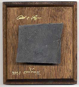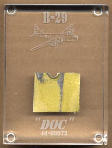 The "Belle" was the most famous because she was the first heavy bomber flying against Hitler in the European war theatre to complete 25 combat missions and keep her entire crew alive. She flew for 10 months from November 7, 1942 to May 17, 1943. The Allied commanding officers in had set 25 missions as an incentive for air crews to go home. Morale was extremely low because 80% of the bombers were shot down during the first three months of America's combat flights over Europe. The Belle's crew shot down 8 German fighters, probably destroyed five others, and damaged at least a dozen more. She dropped more than 60 tons of bombs over Germany, France and Belgium. During her 25 missions, she flew nearly 150 hours, and covered more than 20,000 combat miles. The Memphis Belle has been in Memphis, TN, since July of 1946 when she was saved from the surplus scrap operation in Altus, OK, by the City of Memphis. She is designated a national historic treasure and will never fly again. A section of tire used on the Memphis Belle is mounted on a wooden plaque about 4 inches square. Signatures of the pilot, Bob Morgan, and the 'original' belle, Margaret Polk, are printed in gold on the plaque. However, on this particular plaque, one of the signatures is inverted. This item was made available through the Memphis Belle Memorial Association. Recently, the Memphis Belle was moved to the United States Air Force Museum at Wright-Patterson AFB near Dayton, Ohio. | Piece Of Aircraft Skin Removed During Restoration of Boeing B-29 S/N 44-69972, "Doc", |