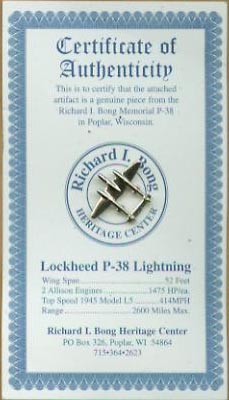 Manufactured by Boeing Aircraft at Wichita, Kansas and delivered to the United States Army Air Force in March 1945, the B-29 Superfortress, no. 44-69972 was sent to Birmingham, AL, for its first major wartime modification. In May 1945, it was assigned to the 3rd Air Force for active service. Afterwards, over a year later, it was placed in storage at Peyote Army Air Force Base, TX, where numerous B-29s were stored between WWII and the Korean Conflict. It was then modified for radar calibration and flew numerous radar defense evaluation flights on the Eastern Seaboard from July of 1951, until February of 1955. Later, the 17th Tow Target Squadron received the B-29 and converted it to a "Tow Target" aircraft for the Air Defense Command at Yuma County Air Force Base, AZ. Its final task with the Air Force was flying to the United States Naval Weapons Center, China Lake Naval Air Station, Ridgecrest, California, on March 14,1956, for use as a ballistic missile target for air combat training. "Doc" was stored on range for many years at Naval Air Warfare Center, until he was recovered on April 15, 1998 and moved to United States Aviation Museum, Inyokern, CA as the last remaining B-29 available for restoration. Now at Boeing plant in Wichita, Kansas, for restoration back to flying condition as FAA registration N69972. (Source: http://b-29.boeing.com/) |  | Silver Lapel Pin made with Aluminum from the Bong Memorial P-38, S/N 44-53236 |