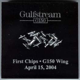 Powered by two fuel-efficient Honeywell 731 engines, the wide-cabin, high-speed Gulfstream G150 offers the best performance in its class with a range of 2,950 nautical miles. Available in three configurations, this aircraft can accommodate six to eight passengers comfortably. The wide-cabin features stand-up headroom, ample aisle space, and generous seated headroom and legroom. G150 benefits include competitive warranty, training and maintenance programs. On January 18, 2005, the first G150 business jet rolled out of the Israel Aircraft Industries (IAI) manufacturing facility in Tel Aviv, Israel and successfully completed its first flight on May 3, 2005. The G150 received type certification from the Civil Aviation Administration of Israel and the U.S. Federal Aviation Administration on November 7, 2005, the first time that two civil aviation agencies certified the same aircraft on the same day. Following extensive flight testing, Gulfstream determined the G150’s maximum range had proven better than originally projected. Drag reduction efforts resulted in an additional 250 nautical miles and a new maximum range of 2,950 nautical miles with two flight crew members and four passengers onboard. Announced in September 2002, the G150 was first delivered to customers in August of 2006. This paperweight contains chips of metal removed from the first parts milled for the wing of the Gulfstream G150. It bears the logo of the project, and the date of the milling. It is 3 inches square in size, and about one inch thick. | At precisely 7 a.m. PST, milling machines at Brek Manufacturing, Gardena, Calif., a platinum source supplier to Northrop Grumman, began cutting metal for the fighter's canopy shelf, which acts as a structural fuel barrier between the fuel tank and the forward fuselage cockpit. Simultaneously, Lockheed Martin, the F-35 JSF prime contractor, began milling other major parts of the F-35's airframe at a subcontractor facility in Arlington, Texas. | Patch Flown on 10th Anniversary of the Delivery Flight of the B-2 Bomber |  |