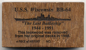 Wisconsin once again entered the inactive fleet in 1958, where she remained until 1988, when she was reactivated. The ship carried new Tomahawk and Harpoon missiles in addition to her 16-inch guns when she steamed to the Persian Gulf in 1990 for Operation Desert Storm. After effective use of missiles and high explosives in the desert conflict, the battleship returned home to be decommissioned for the third time in September 1991. Still a defense asset, she now on display at the Hampton Roads Naval Museum in Virginia. During the recommissioning in October of 1988, all of the teakwood decking was replaced. The U.S.S. Wisconsin Association was able to obtain some of this teakwood, from where this piece originated. This is piece is numbered 343. | |