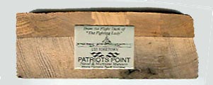 Named for the CV-2 scuttled by the Navy after sustaining serious damage in the Battle of the Coral Sea in May of 1942. Lexington served as the flagship of Fast Carrier Task Force 58 under the command of Admiral Marc Mitscher. Mitscher is credited with making the aircraft carrier task force the predominant naval weapon system of the 20th century while aboard Lexington in the western Pacific. Lexington participated in every major naval campaign from Tarawa to Tokyo and was hit twice by the enemy. Lexington was nicknamed "The Blue Ghost" by the Japanese propagandist Tokyo Rose because she never wore the typical camouflage paint of all the other U.S. aircraft carriers. After World War II, Lexington was modernized and recommissioned in 1955 for Cold War service in the U.S. Navy. This small piece of her flight deck bears silent witness to many of the actions of World War II, as well as the training endured by many young aviators who have since defended America. During the 1980's, the U.S. Navy came to the realization that keeping in service its last remaining World War II Essex Class aircraft carrier was becoming increasingly expensive and that the USS Lexington would have to be replaced by a more modern ship. In August of 1990, the Secretary of the Navy announced that the USS Forrestal would replace USS Lexington as the Navy's training carrier. |  | Piece of the Teakwood Deck of the Battleship USS Wisconsin, BB-64 |  |