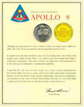 On the flight of Apollo 8, Commander Frank Borman carried a half-inch diameter sphere of aluminum (type 2219) alloy in his "Personal Preference Kit" along with other personal item he wished to take with him. This particular alloy was chosen because in represented many of parts used in many of the critical structural parts of the Saturn V rocket. After the mission, the sphere was returned to the Marshall Space Flight Center. For fear of loss, the sphere of Lunar-flown metal was cut in half. One of the pieces remained safely in Huntsville, while the other was flown to the Alcoa plant in D avenport, Iowa. Under the watchful eyes of NASA and Boeing representatives, it was added in a smelting furnace to a molten batch of aluminum (type 1100) alloy. The ingots products were then transported to the Barco Mint of New Orleans. At the mint, a total of 200,000 medallions were struck and packaged in bags of 500 each. All left-over scraps from the minting process were certified as 'destroyed' by John Barr, the president of Barco Mint on June 30th, 1969. The medallions were then shipped to the Boeing Company in Huntsville (who were responsible for most of the subcontracting arrangements). From there they were distributed to the principal Saturn contractors and NASA agencies which had anticipated in the Apollo program. These medallions containing flown metal are now commonly referred to as the "Manned Flight Awareness Medallions" (or "Space Flight Awareness Medallions" for more recent productions).
