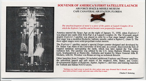 Explorer-I, officially known as Satellite 1958 Alpha, was the first United States earth satellite and was sent aloft as part of the United States program for the International Geophysical Year 1957-1958. The satellite was launched from Cape Canaveral (Launch Complex 26) in Florida at 10:48 P.M. EST on 31 January 1958. The 30-pound, pencil-shaped satellite was placed into orbit by a four stage launch vehicle. The first stage was a modified Redstone ballistic missile, called a Jupiter-C, while the upper three stages were solid-propellant rocket motors. Carrying a special Geiger counter designed & developed by Dr. James Van Allen (from the University of Iowa), the device discovered the belt of trapped radiation surrounding the earth, which was later named the Van Allen radiation belt. These cards were produced by the Air Force Space & Missile Museum at Cape Canaveral Air Station, Florida. The small fragment of metal on the card is a piece of the gantry at Launch Complex 26 in which the Explorer I satellite at its booster were prepared for launch. |