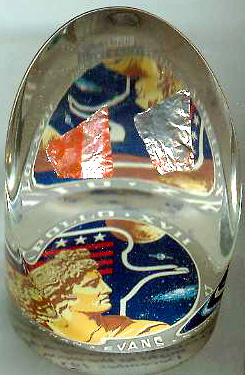 First launched on July 16, 1982 from Space Launch Complex 2 at Vandenberg Air Force Base, the McDonnell-Douglas 'Delta 3920' rocket could place 3,451 kilograms into a 185 kilometer orbit, or a 1,283 kilogram payload into geosynchronous orbit. The rocket provided a thrust of 310,630 kilogram-force, and the total rocket weight was 192,360 kilograms. It's core diameter was 2.4 meters, and was 36 meters in length. It costs $38.32 million in 1985. | Place your pointer over the photo to see the reverse of the paperweight |