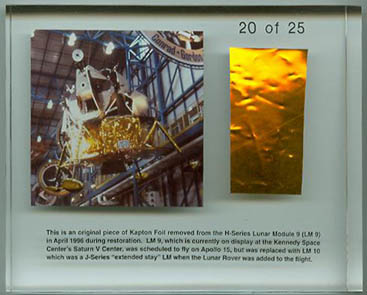 Originally scheduled to fly with the Apollo 15 mission, it was replaced by LM-10 when it was decided to move into a J-Series "extended stay" Lunar Module instead of LM-9's H-Series configuration. Now on display at the Saturn V Center at the Kennedy Space Center in Florida, it is displayed "as built by Grumman" and is supposed to be ready to be able to go to the Moon (except it is missing the landing radar heat shield and the surface contact probes on the footpads). It is suspended from the museum's roof by four cables, attached to the landing gear outriggers. These are the same mount points used to attach the Lunar Module to the Saturn V's Spacecraft Lunar Module Adapter. During restoration work on LM-9, some of the Kapton foil, a thin mylar material used to protect the astronauts in outer space, was removed and replaced. The removed foil was used to produced these lucite displays. The presentation piece was produced by the same company that did the "Liberty Bell" project for the Kansas Cosmosphere. Each acrylic embedment measures approximately 4" x 5" x 1" and is accompanied by a Certificate of Authenticity from a consultant on the restoration project. There was a total production run of only 25 pieces and each piece is individually numbered and varies slightly because of the size and shape of the foil. This is lucite display #20.