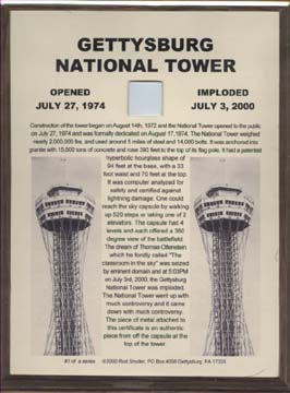The structure weighed nearly 2,000,000 pounds, with five miles of steel connected by 14,000 bolts. The Tower was anchored into granite with the help of 15,000 tons of poured concrete. At its highest point, it rose to 393 feet (the top of its flag pole and lightning rod), and featured a hyperbolic hourglass design measuring 94 feet at its base. The top capsule of the tower had four levels, and could hold up to 750 visitors, accessed by two elevators, or a 508-step stairwell. The structure was owned by Thomas R. Ottenstein and the Overview Limited Partnership. Ottenstein called the Tower a "Classroom in the Sky", giving tourists and school students an aerial view of the historic battlefield. However, some historians and preservationists considered it an ugly modern intrusion to the battle site, and started the campaign to have it removed. The federal government and the National Park Service seized the land by eminent domain in December of 1999, as part of an ongoing program to restore portions of the battlefield to their historical conditions. After legation, the seizure was upheld by the legal system and the tower closed permanently to visitors on June 15th, 2000. It was imploded to the sound of Civil War reenactor's simulated cannon fire on July 3, 2000 at 5:03 PM, EST. Controlled Demolition Incorporated (CDI) and the Loizeaux family of Baltimore, Maryland, donated their services to demolish the tower using ten pounds of explosives in a safe matter. In May of 2006, and after years of legal wrangling, a federal judge has ordered the National Park Service to pay $4 million to the owners of an observation tower. Ottenstein, however, died in August of 2000, merely a month after his tower was demolished. The bulk of the tower's galvanized steel was recycled. However, a small portion was saved and used of souvenir purposes. Attached to the certificate is a piece of metal, painted white and measuring one inch square, from the tower's capsule. |  | World Trade Center Commemorative Medallion, Made From WTC Steel |