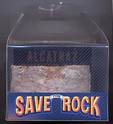 Out in the middle of the San Francisco Bay, the island of Alcatraz is a world unto itself. Isolation, one of the constants of island life for any inhabitant - soldier, guard, prisoner, Indian, bird or plant - is a recurrent theme in the unfolding history of Alcatraz. Alcatraz Island is one of Golden Gate National Recreation Area's most popular destinations, offering a close-up look at a historic and infamous federal prison long off-limits to the public. Visitors to the island cannot only explore the remnants of the prison, but can also learn about the Indian occupation of 1969 - 1971, early military fortifications (the first U.S. fort on the Pacific coast), and the West Coast's first (and oldest operating) lighthouse. These structures and the island's many natural features - gardens, tide pools, bird colonies, and bay views beyond compare - are being preserved by the National Park Service which is working to make it accessible to visitors, preserve its buildings, protect its birds and other wildlife, and interpret its history. Alcatraz is currently undergoing a major renovation, as historic buildings are being stabilized, adapted for new uses, and preserved for the future. This work will generate several tons of rubble, most of which must be removed from the island. But in a unique arrangement with the National Park Service, members of the public are being invited to help save the Rock by purchasing a piece of its history. Small rocks - actually pieces of construction rubble -- are being packaged and sold as educational materials, telling the story of ongoing repair, replacement, and preservation on Alcatraz. This effort will keep some of the debris out of landfills and will also help defray a portion of the cost of this multi-year restoration project. It even comes in it's own carrying case! (Source: NPS - GGNRA & the Golden Gate National Parks Conservancy) |